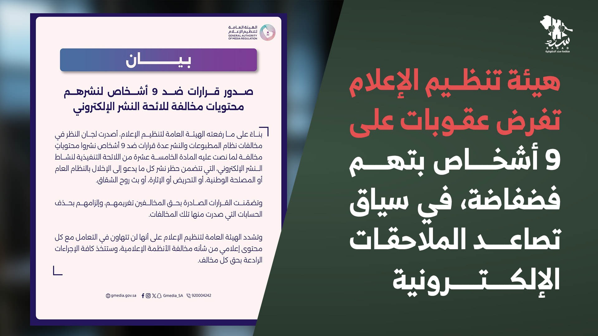 استمراراً في سياسة القمع وفرض الصوت الواحد، أصدرت الهيئة العامة لتنظيم الإعلام قرارات عبر لجان النظر في مخالفات نظام المطبوعات والنشر، وهي لجان تتبع الهيئة وتعد أحد أذرعها التنفيذية المختصة بتطبيق الأنظمة واللوائح الإعلامية المزعومة، وذلك بحق تسعة أشخاص بدعوى نشرهم محتويات مخالفة للائحة النشر الإلكتروني