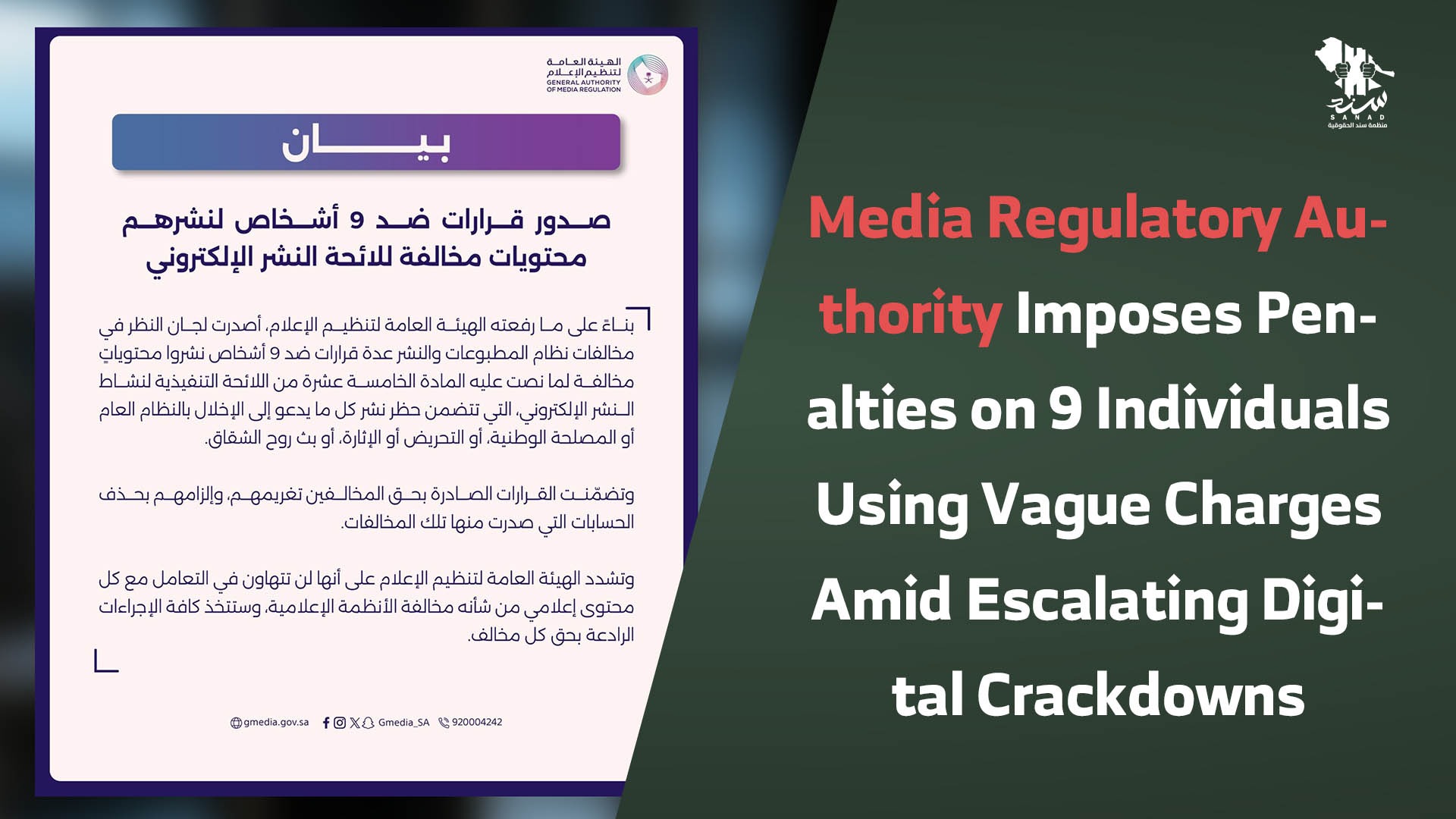GCAM justified its actions by invoking Article 15 of the Executive Regulations for Electronic Publishing, which relies on vague, broadly interpretable terms such as “disrupting public order,” “provocation,” and “incitement.” SANAD notes that these terms are routinely used to restrict freedom of expression and punish peaceful criticism.