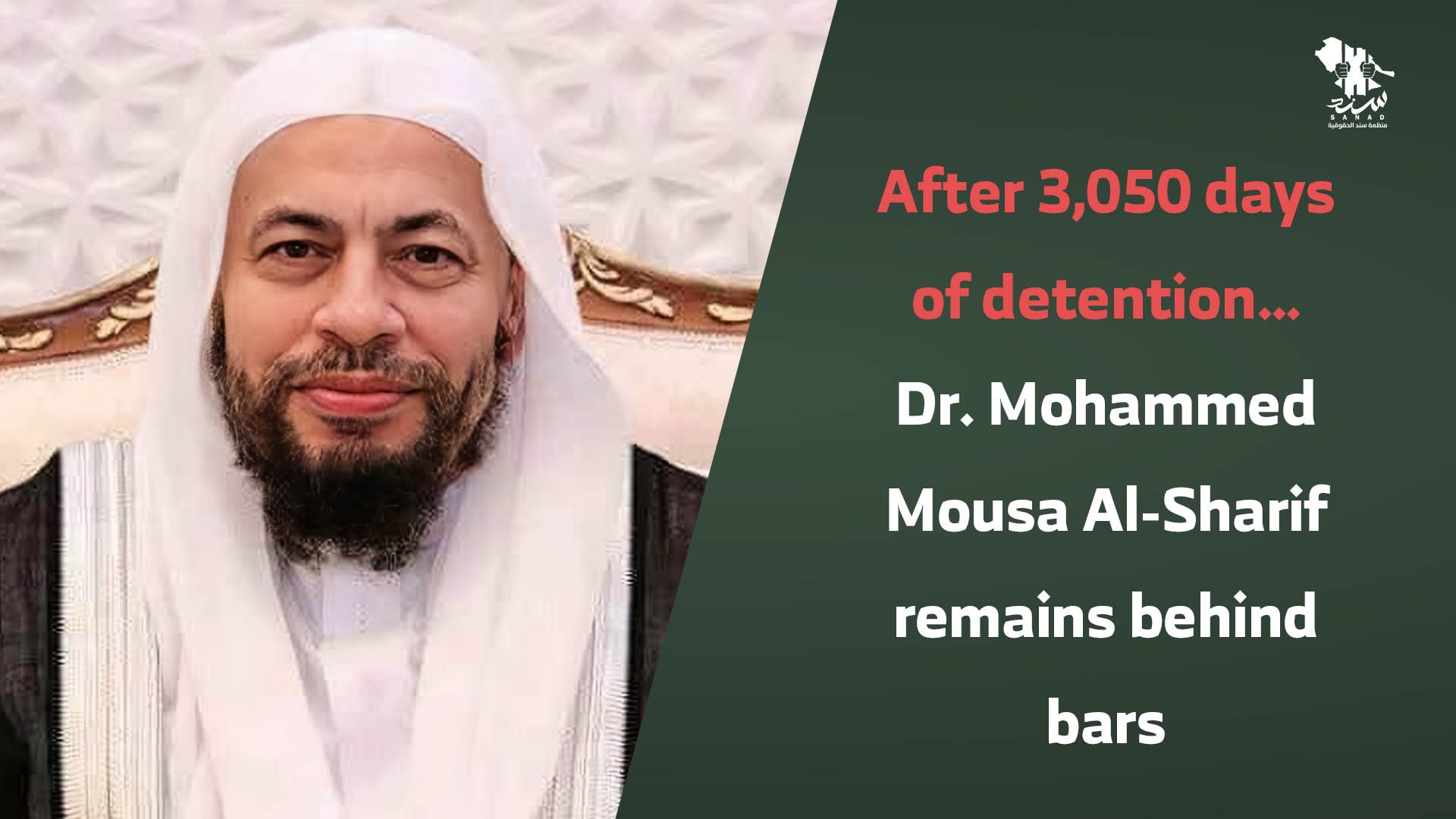 SANAD Human Rights Organization calls for the immediate and unconditional release of Dr. Mohammed Mousa Al-Sharif, an end to all violations against him, and the release of all prisoners of conscience in Saudi Arabia.